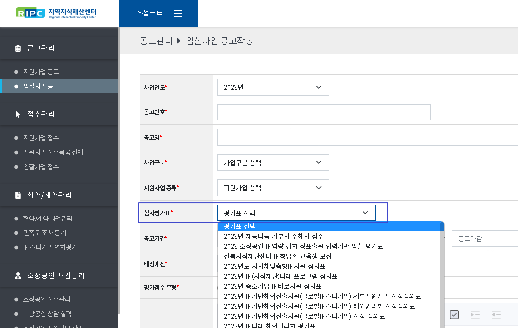 - 입찰사업 공고의 평가표는 본회에서 등록하기도 하며, 지원사업 평가표와 양식을 공유합니다.