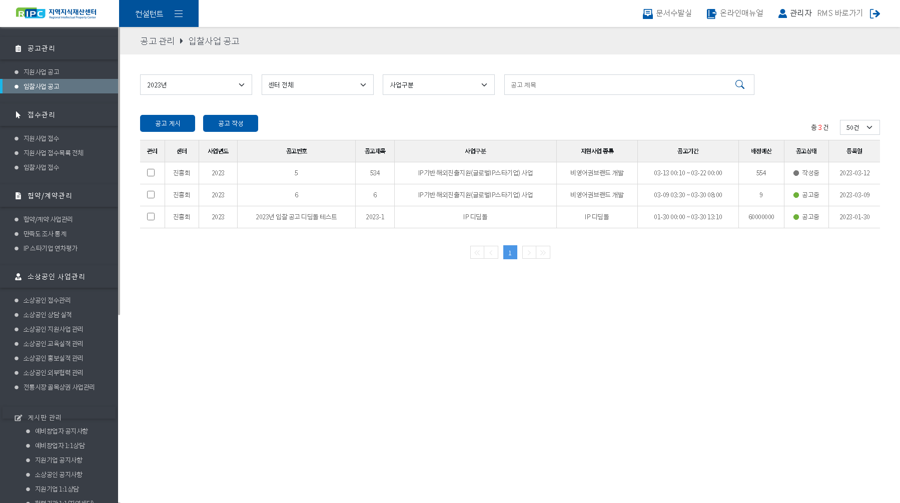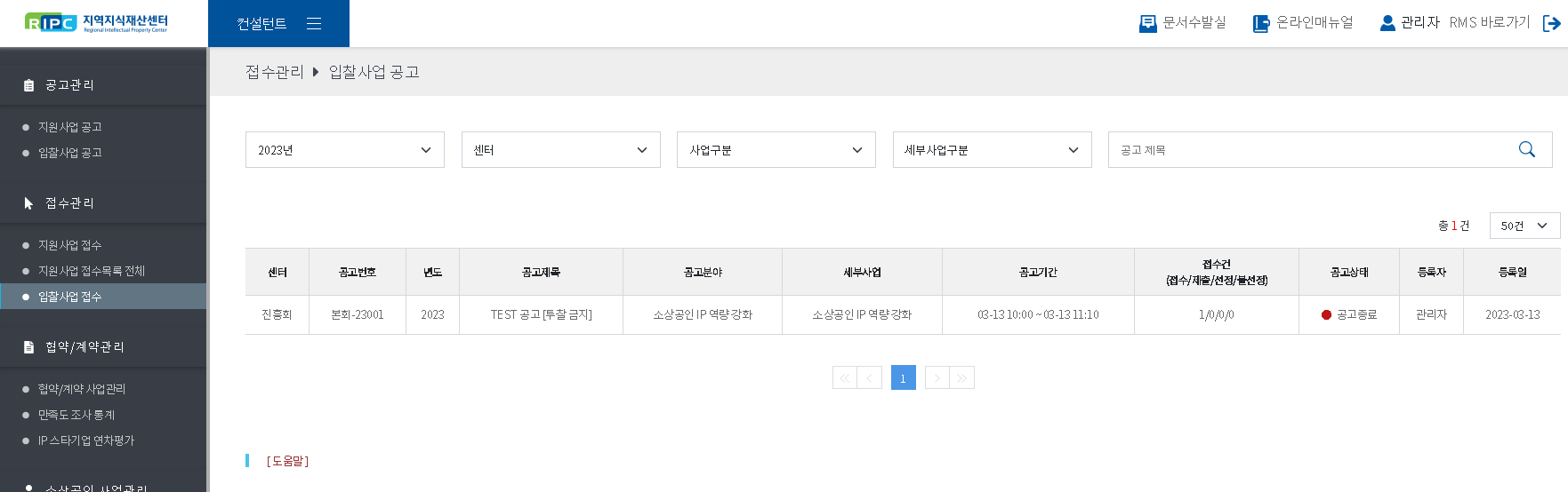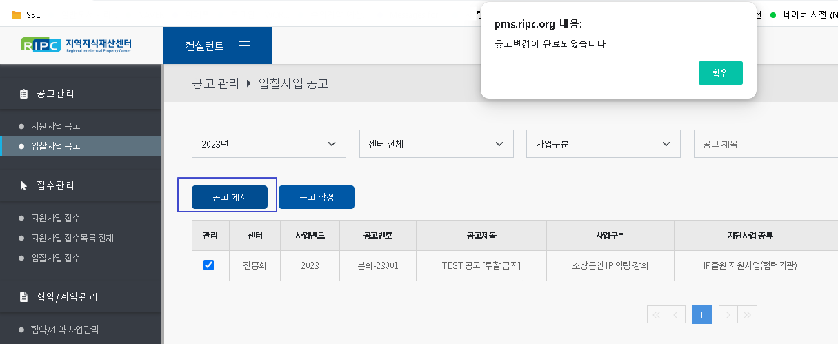 - [공고게시]를 해야만 대민서비스(pms.ripc.org)의 협력기관에게 노출됩니다.