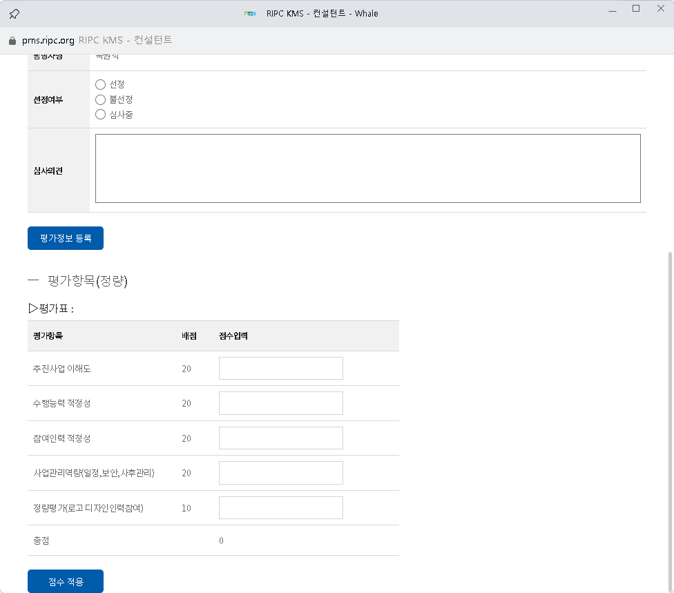 이미 각 센터별 <오프라인 심사> 절차등을 통해 산술평균(최고점/최저점 제외, 평균 평가점수) 완료된 점수를 기록을 위해 등록