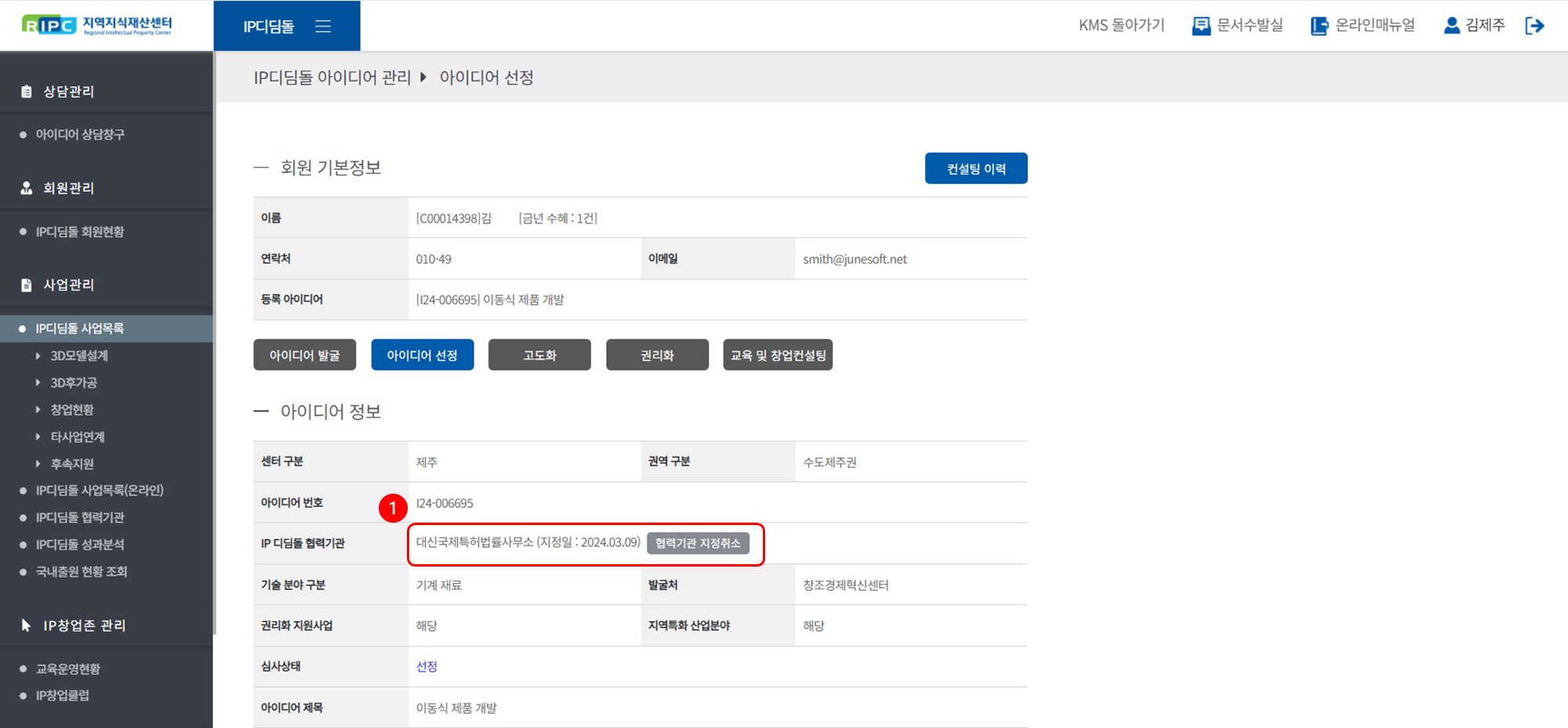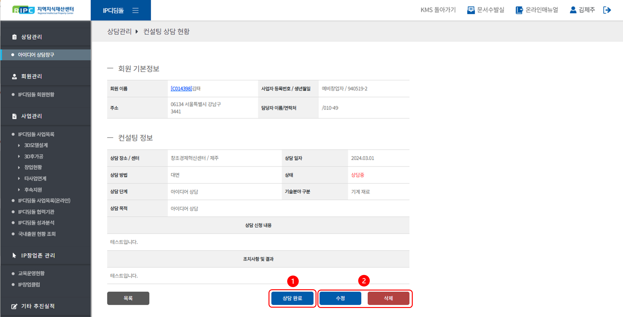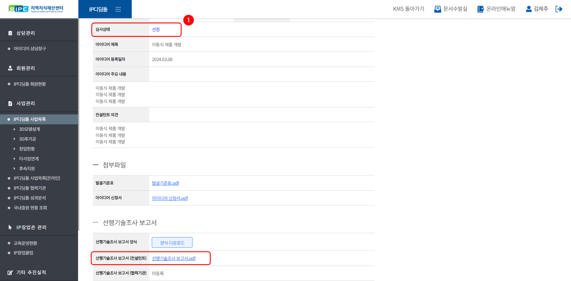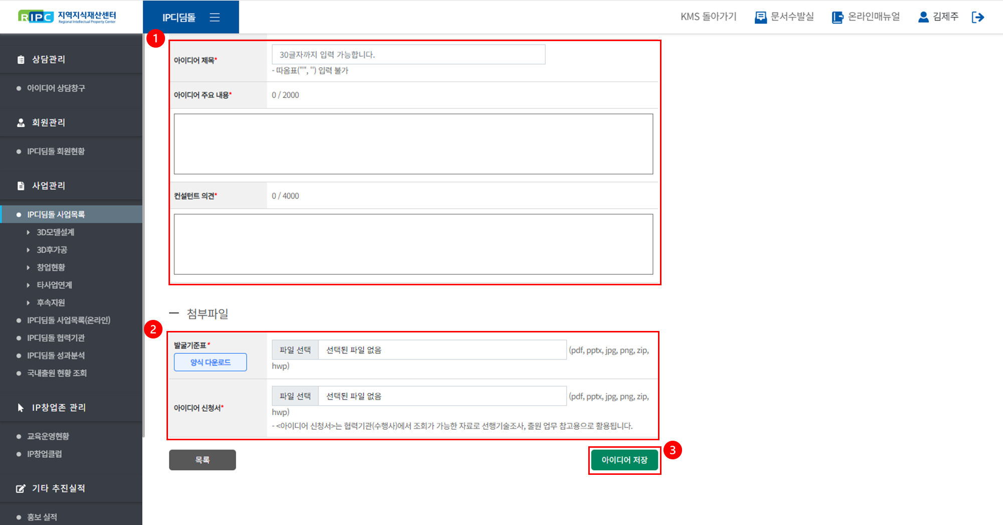 지역지식재산센터 컨설턴트 시스템에서 IP디딤돌 사업을 관리/운영하실 수 있습니다.