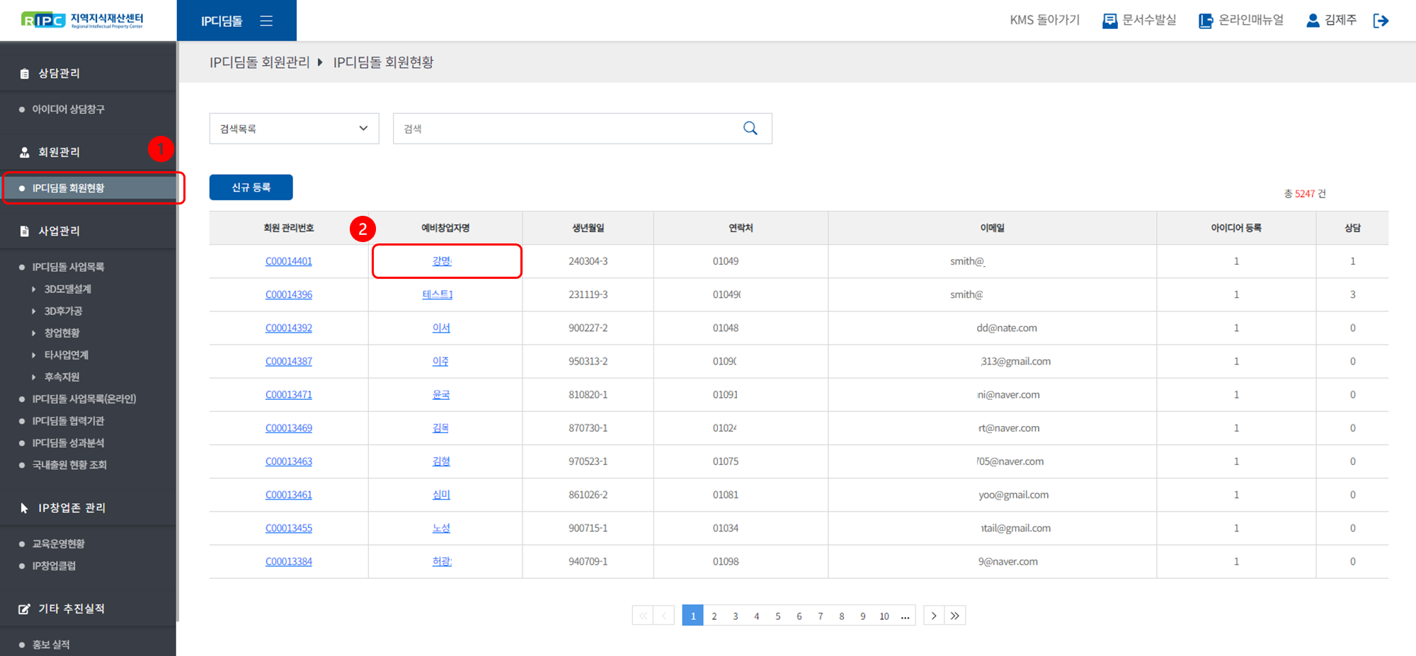 ① [회원관리 > IP디딤돌 회원현황] 메뉴로 이동해 주세요.