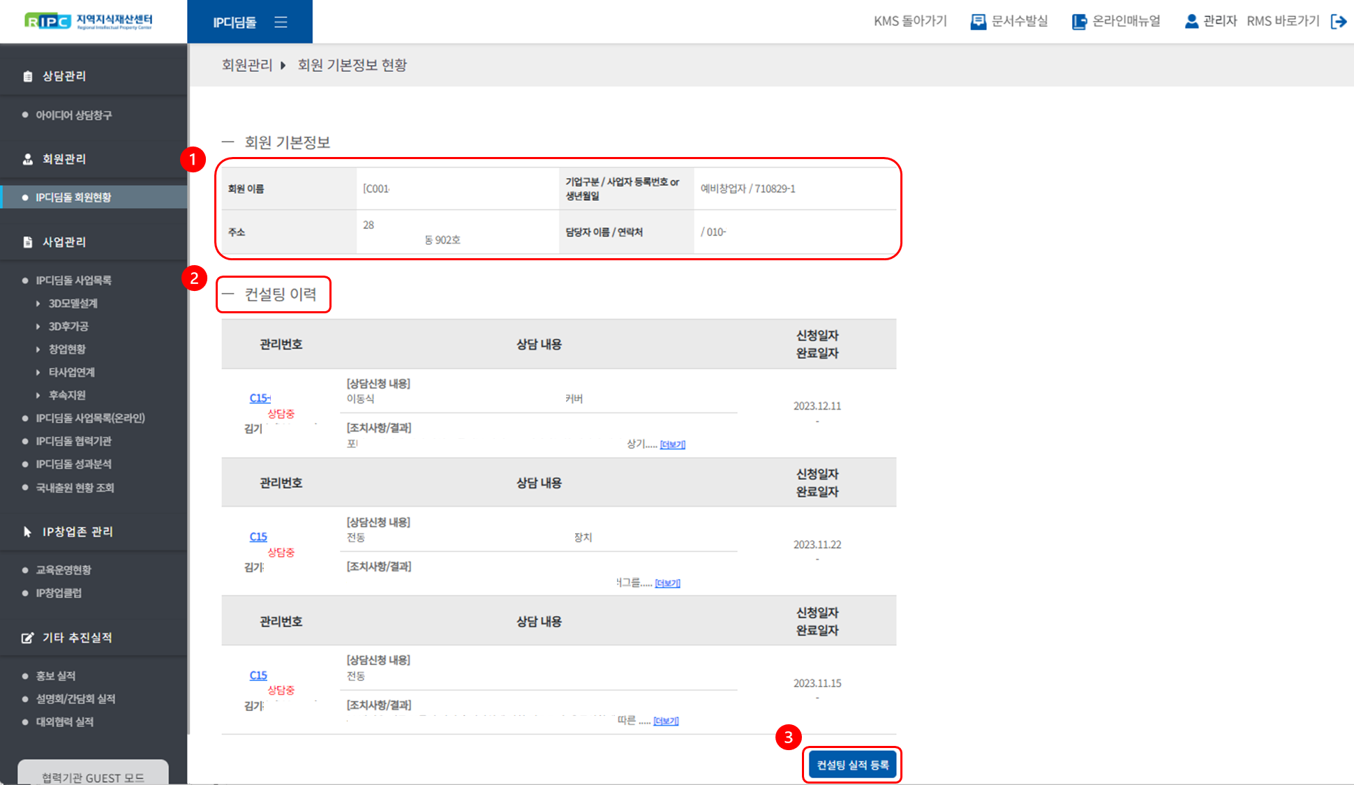기업(회원) 정보와 특정 기업(회원)의 누적된 컨설팅 이력을 일괄 확인하실 수 있습니다.