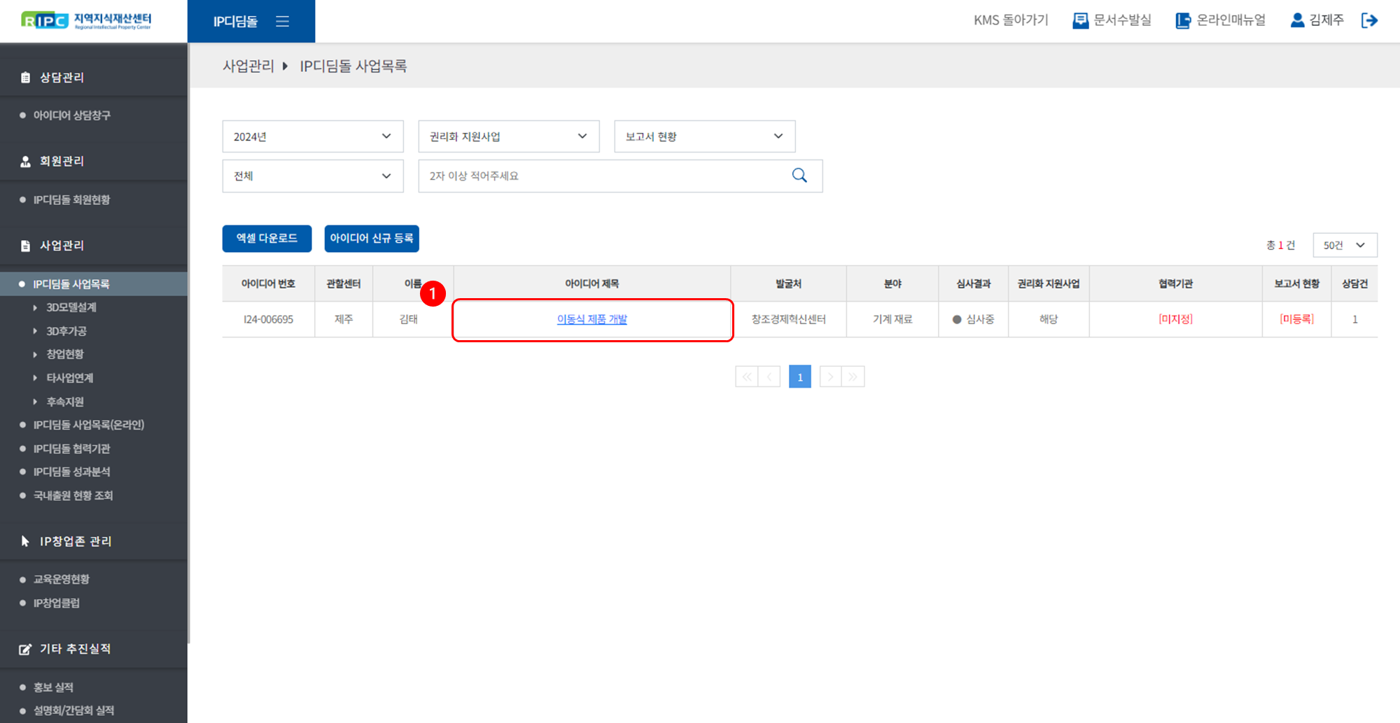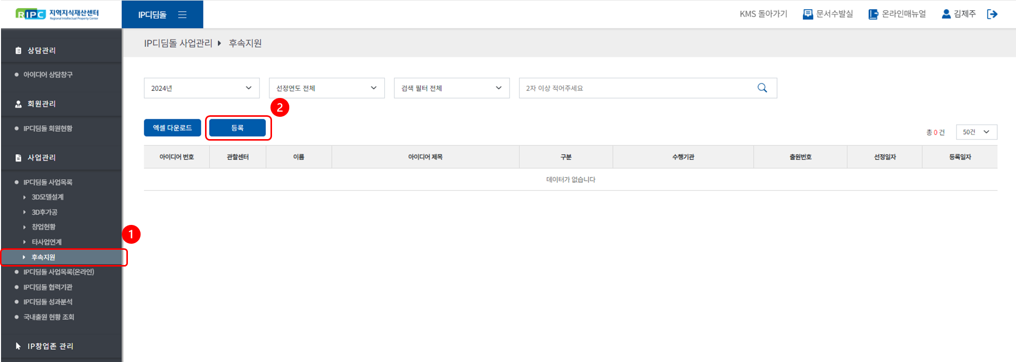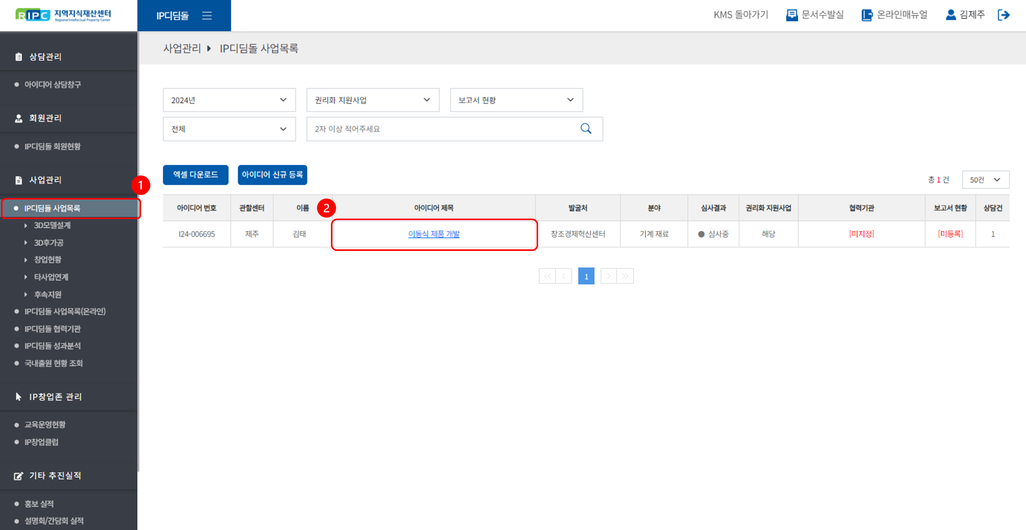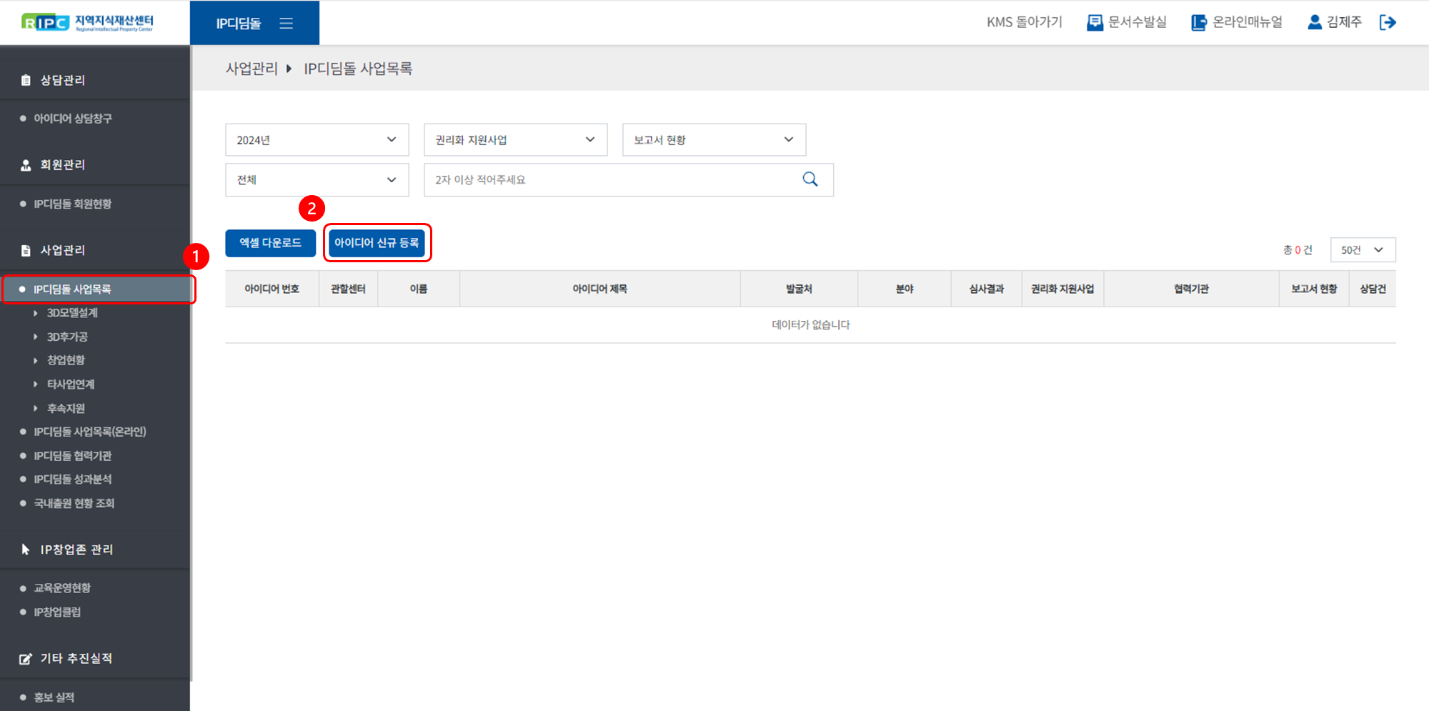 ① [사업관리 > IP디딤돌 사업목록] 메뉴로 이동해 주세요.