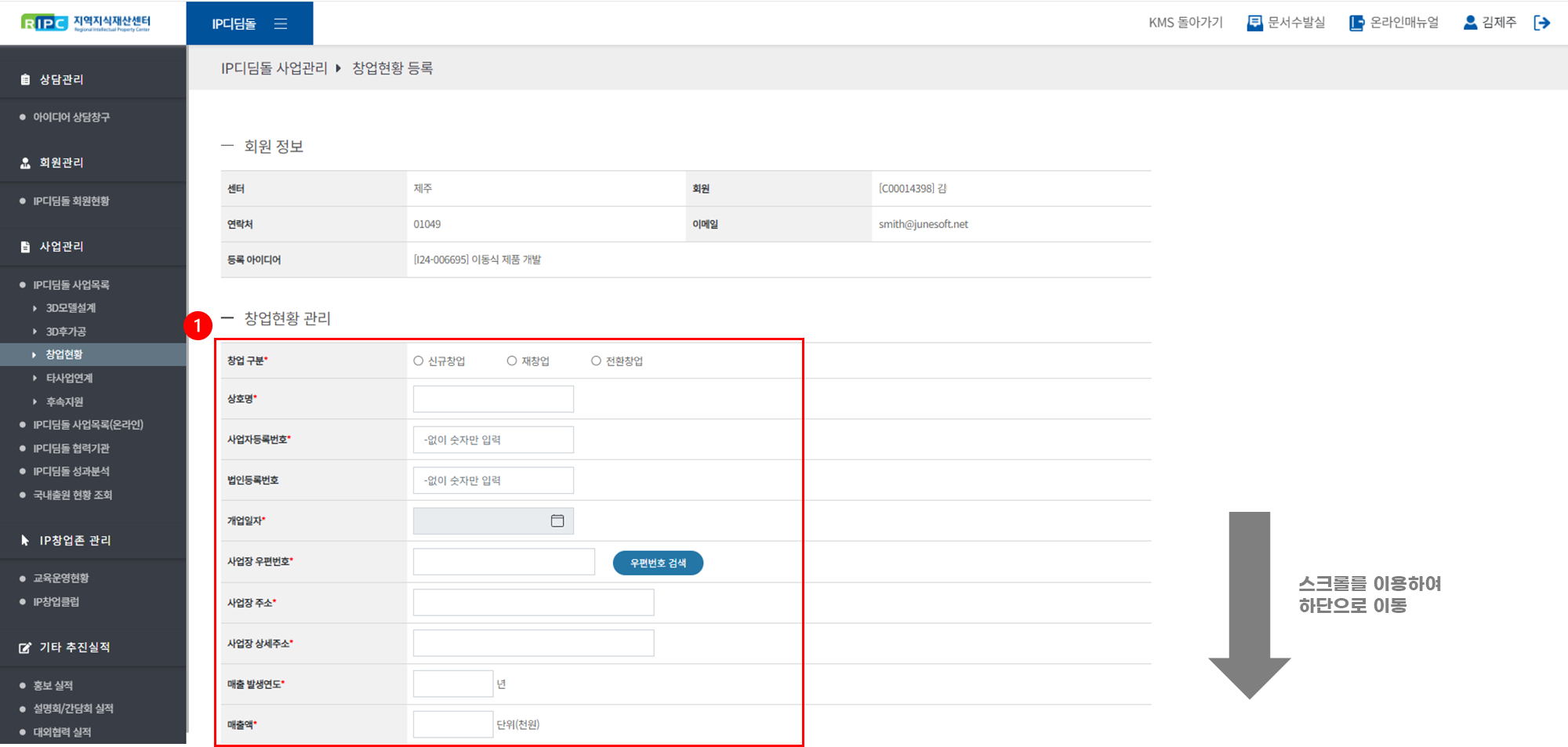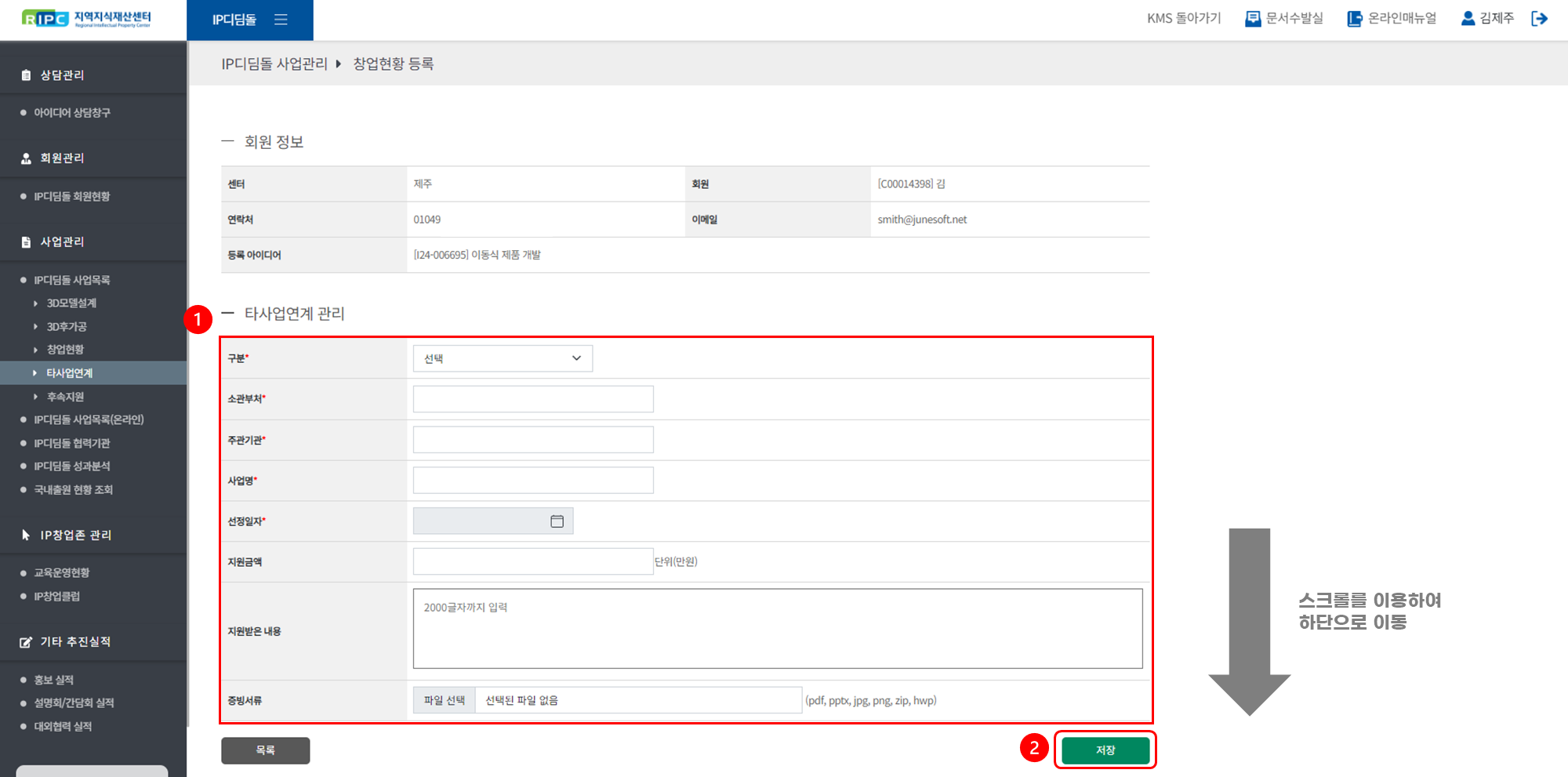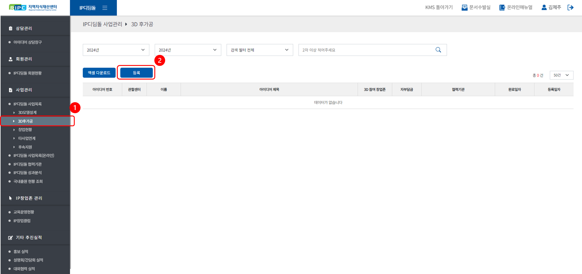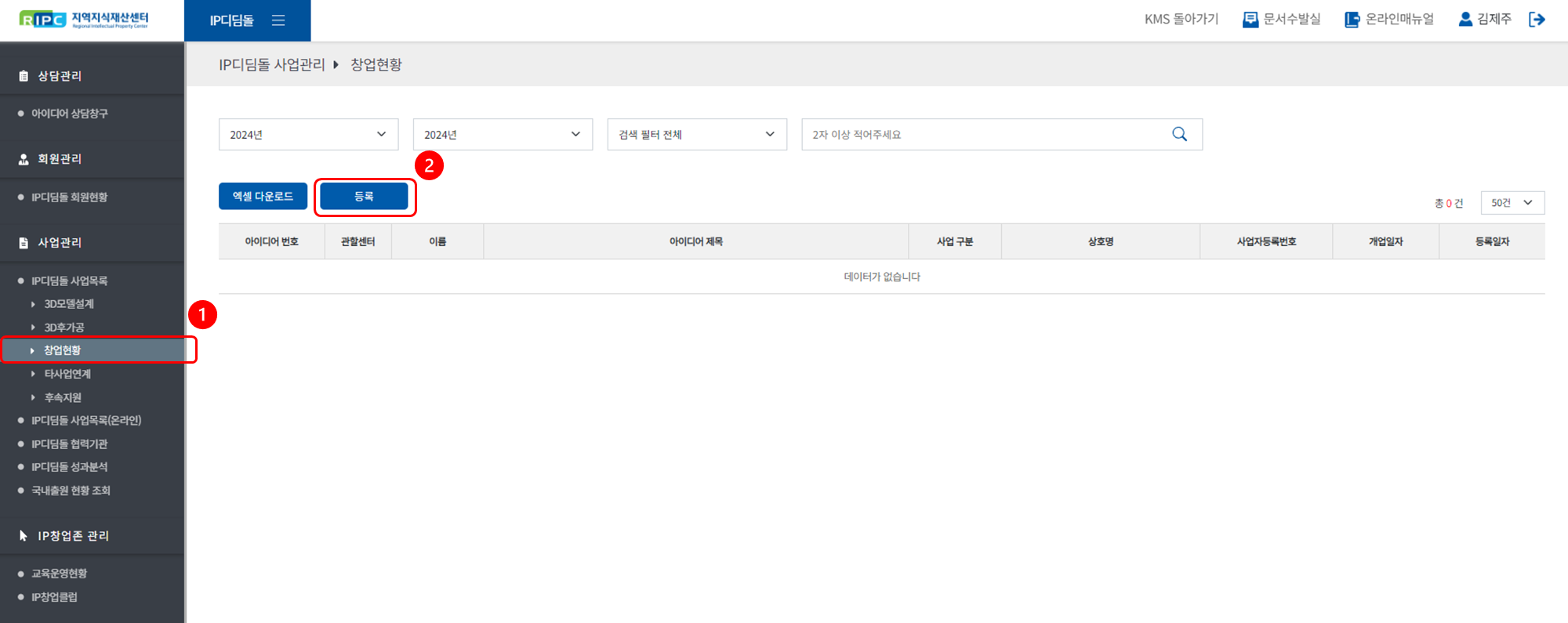 ① [사업관리 > IP디딤돌 사업목록] 메뉴로 이동해 주세요.