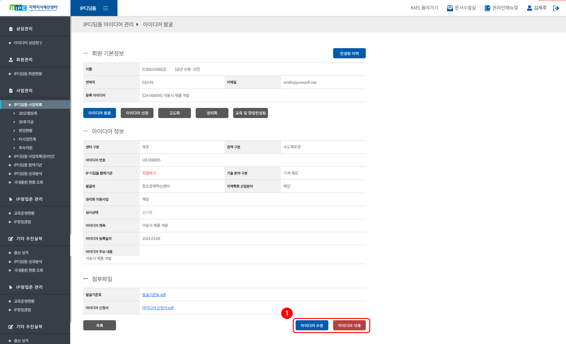 ① [아이디어 수정] [아이디어 삭제] 버튼을 이용하여 아이디어 정보를 관리하실 수 있습니다.