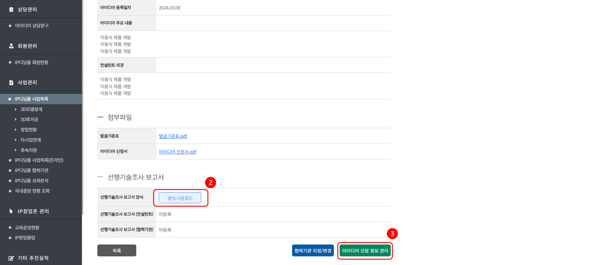 ③ [아이디어 선정 정보 관리] 버튼을 Click해 주세요.
