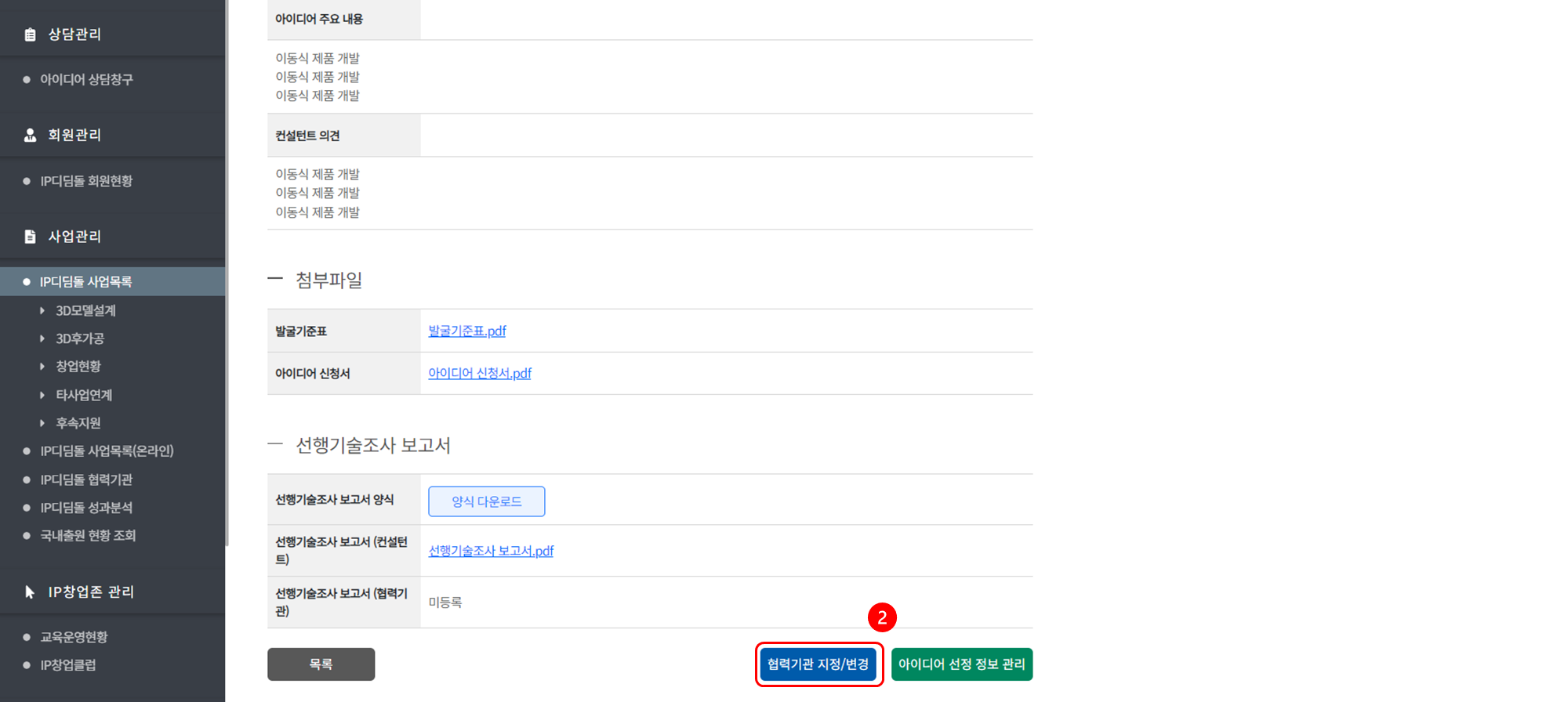 아이디어 선정 Tab에서는 아이디어 심사상태 관리와 협력기관 지정 관리가 가능합니다.