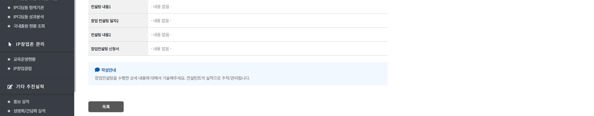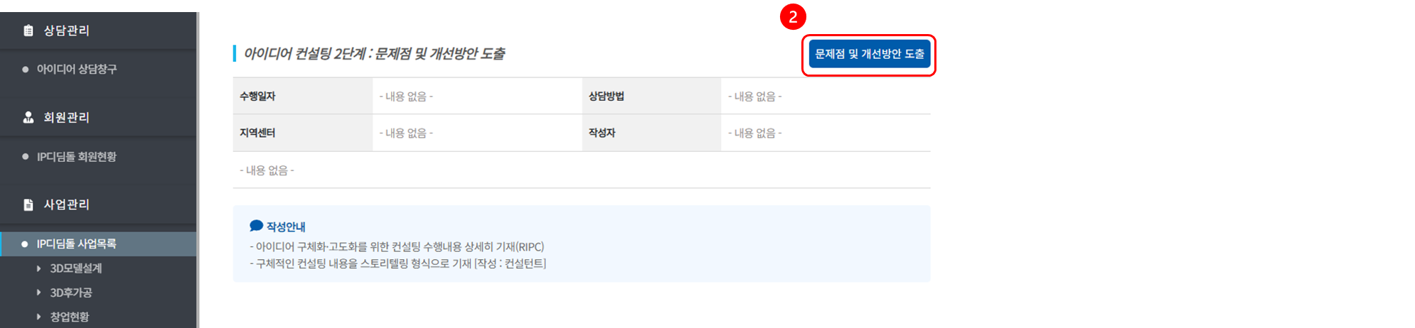 ② 컨설턴트가 예비창업자를 대상으로 진행한 컨설팅 내용을 [창업 컨설팅 관리]에 작성해 주세요.