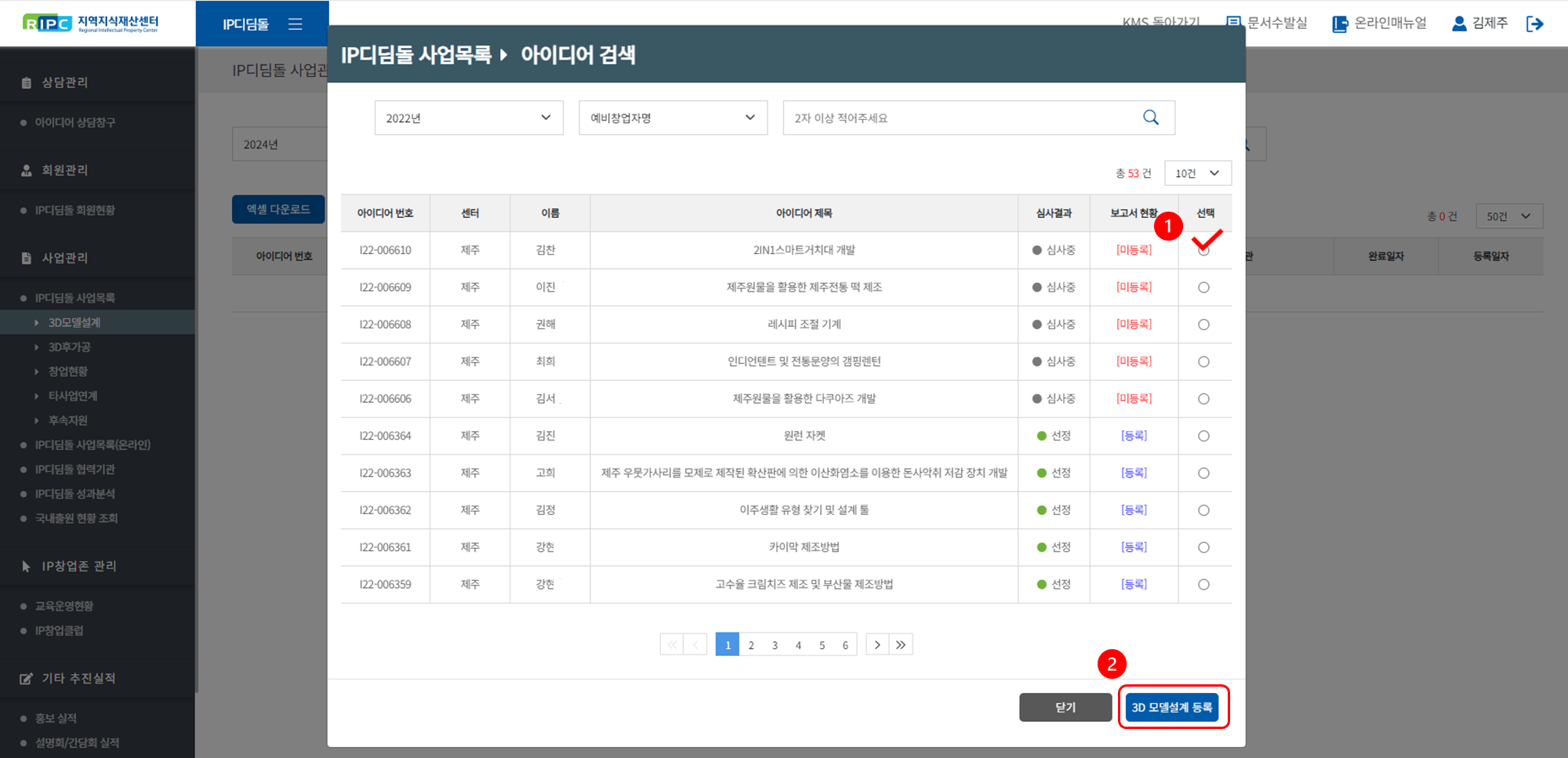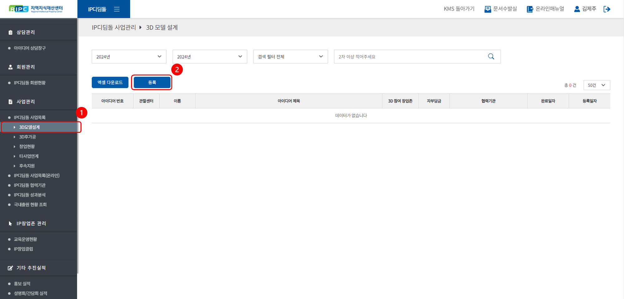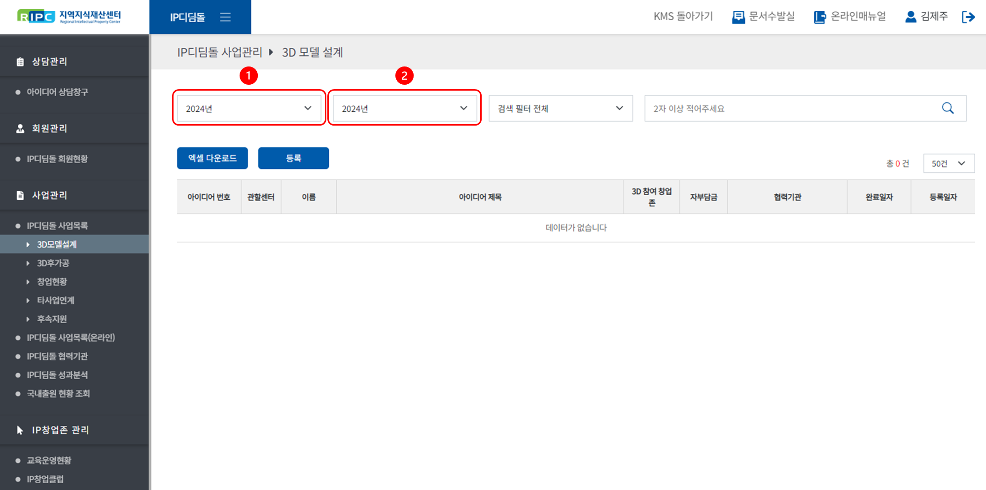 우리 센터에서 IP디딤돌 출원 및 비용 지원을 받은 예비창업자에게 3D 모델설계을 지원한 이력을 추적/기록합니다.