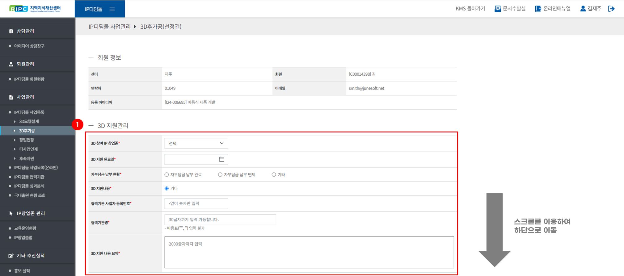 우리 센터에서 IP디딤돌 출원 및 비용 지원을 받은 예비창업자에게 3D 후가공을 지원한 이력을 추적/기록합니다.