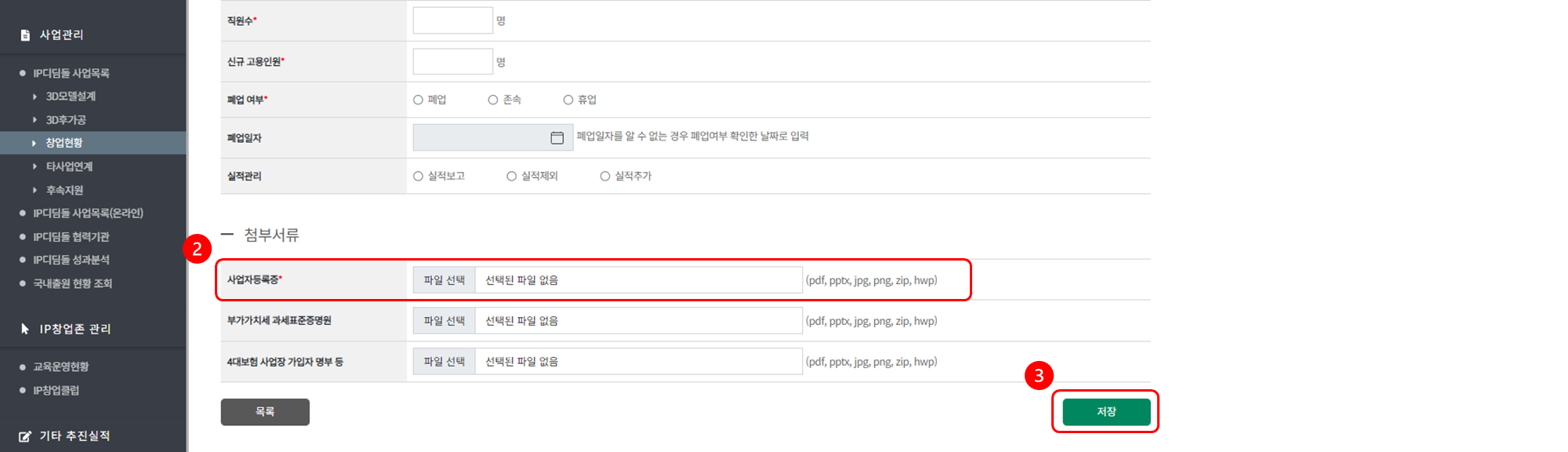 ③ 모두 입력 후 [저장] 버튼을 Click해 주시면 창업현황 이력이 등록됩니다.