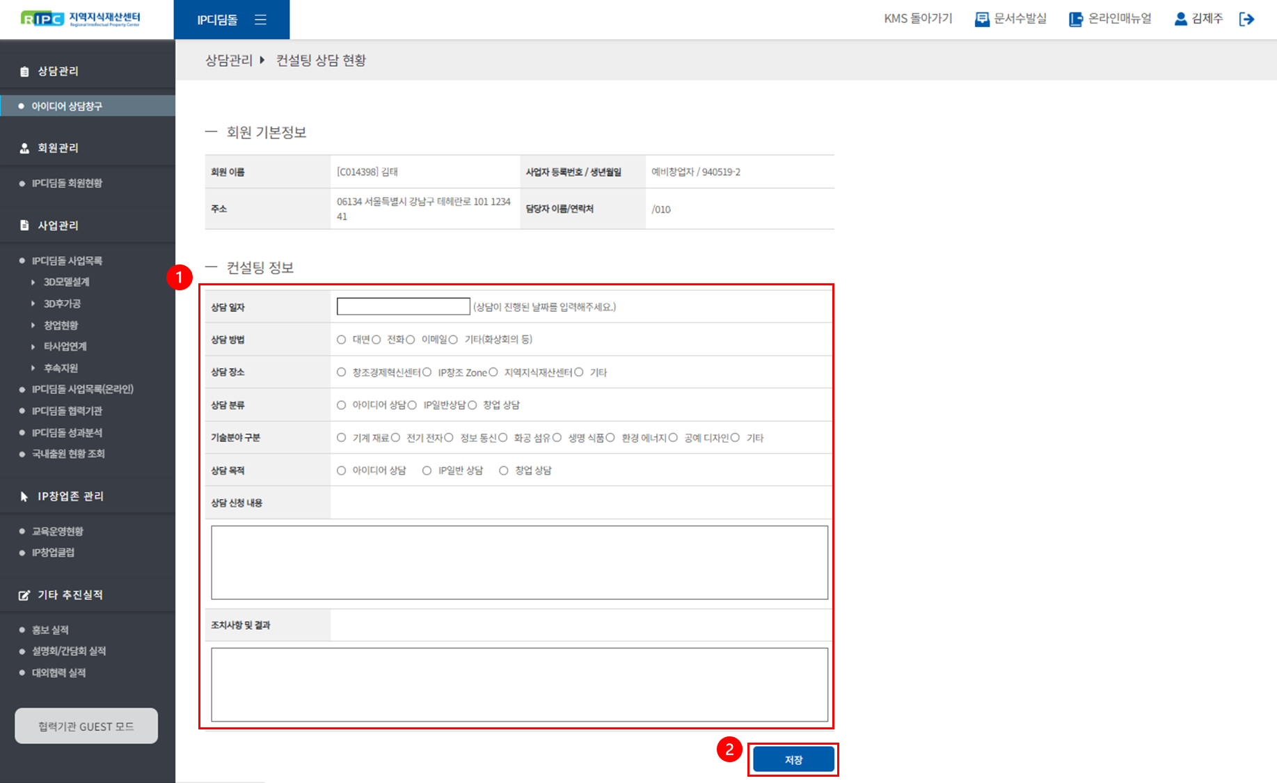 ② [저장] 버튼을 Click해 주시면, 컨설팅 상담 등록이 완료됩니다.