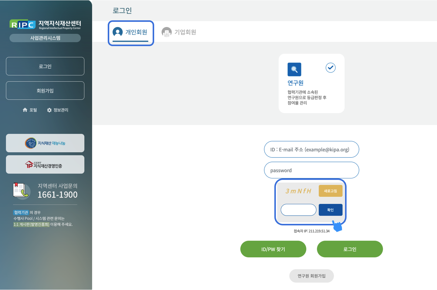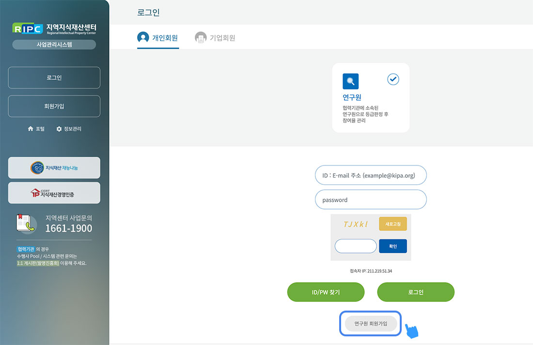 로그인 화면에서 [개인회원] 클릭 후 하단 [연구원 회원가입] 버튼 클릭