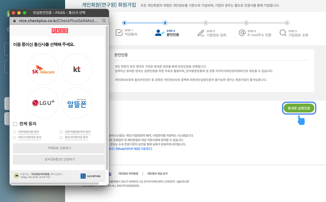 ✅ 개인 연구원은 통신사의 본인 확인 서비스를 통해 실명을 인증하고, 실명인증된 휴대폰 번호로 회원가입을 합니다.