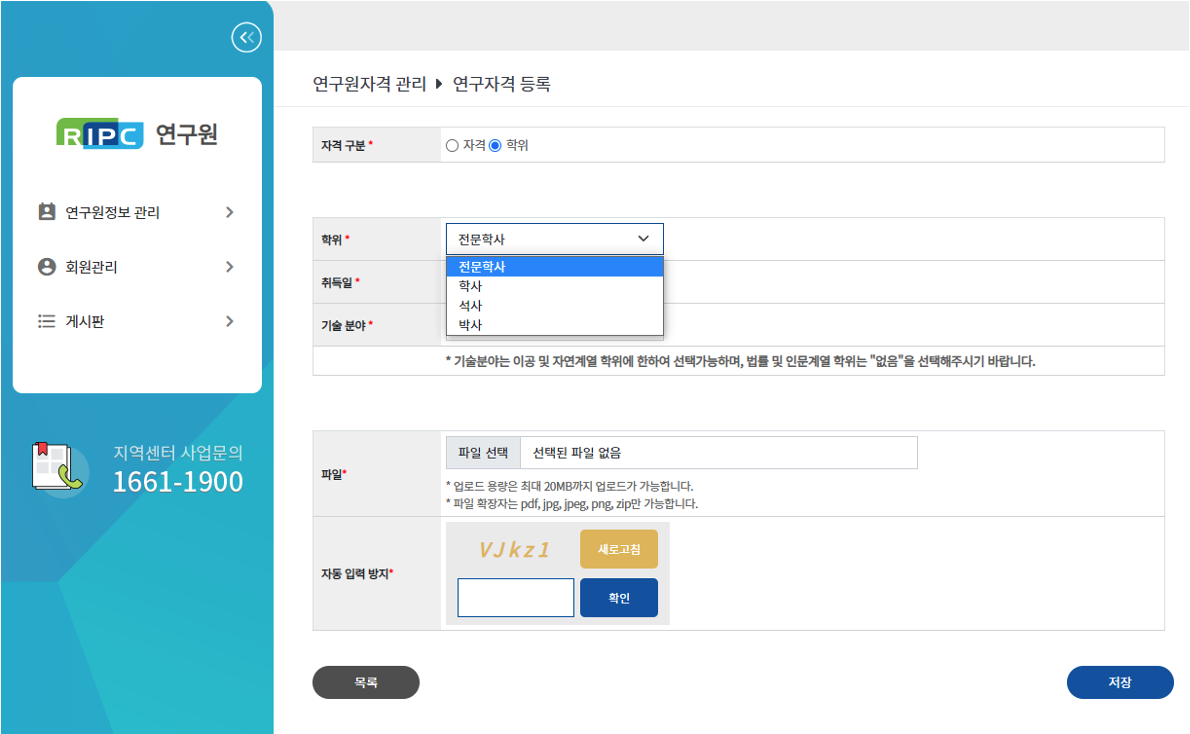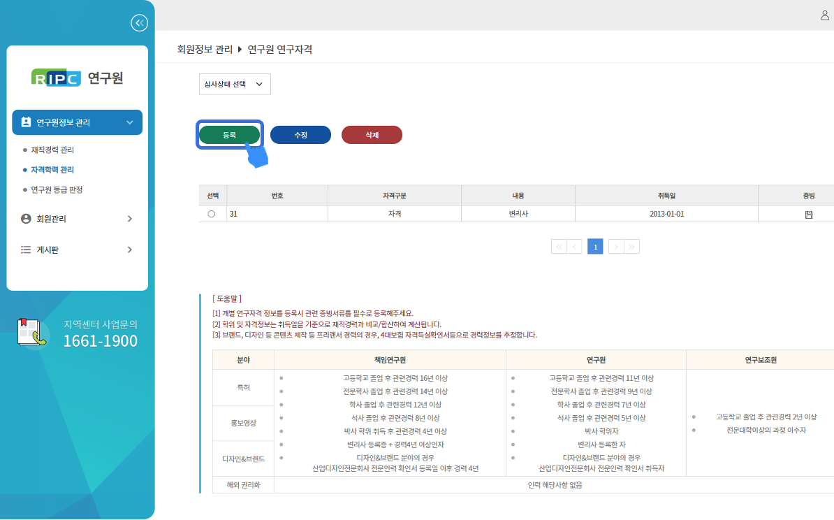- 자격과 학력도 등록 후 발명진흥회 사업관리자가 승인해야 등급판정에 활용됩니다.
