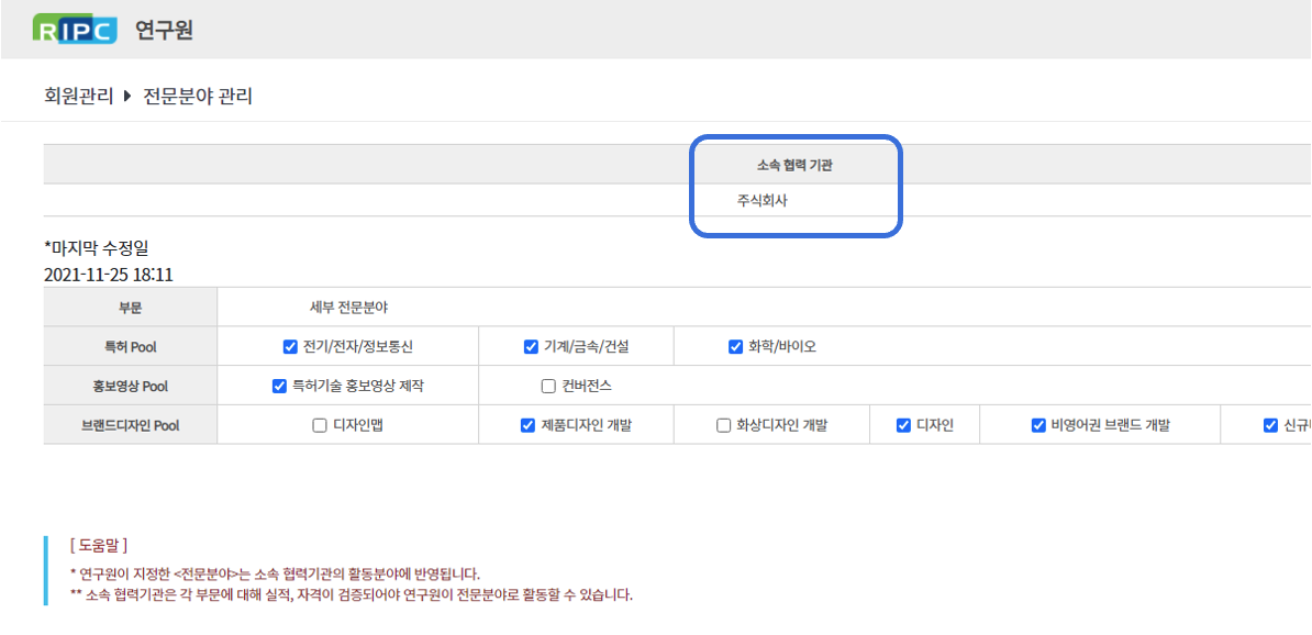 ✅ [회원관리 > 전문분야 관리] 에서는 활동가능한 전문분야를 체크해주세요. 반드시 <소속 협력기관>이 존재해야 합니다.