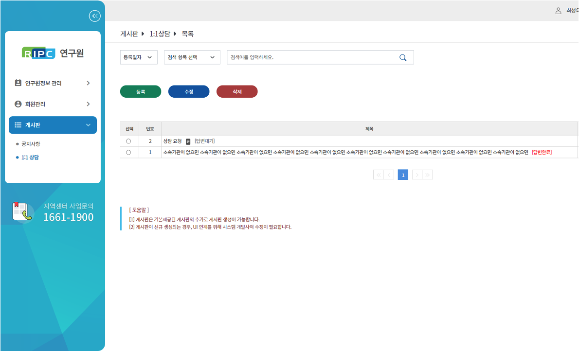 - [게시판 > 1:1 상담] 서비스로 연구원 개인에 대한 온라인 상담은 발명진흥회에서 직접 진행합니다.