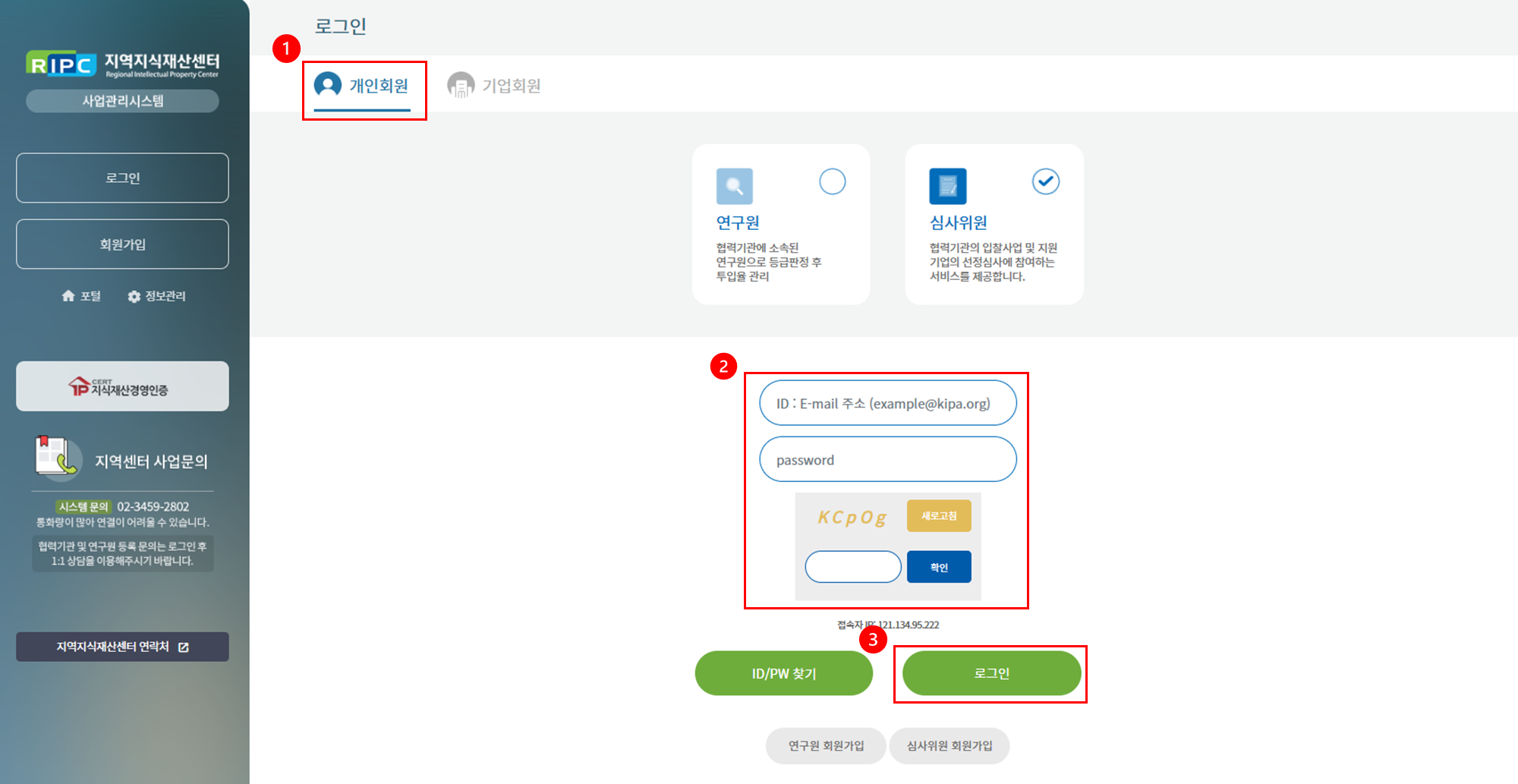 ① [개인회원] 버튼을 Click하고, 심사위원에 체크해 주세요.