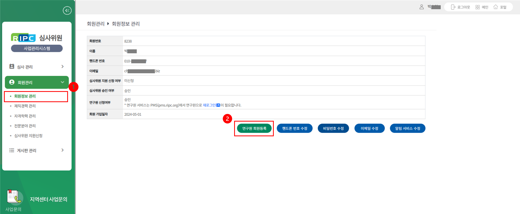 ✔️ 회원등록 신청이 완료되면, 심사위원 계정으로 연구원 시스템 로그인 가능