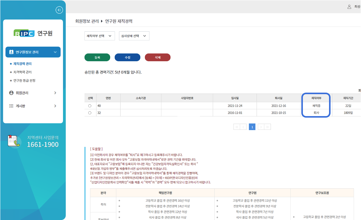 - 재직경력, 자격학력은 반드시 발명진흥회 사업관리자로부터 [승인]이 되어야 등급판정에 활용됩니다.